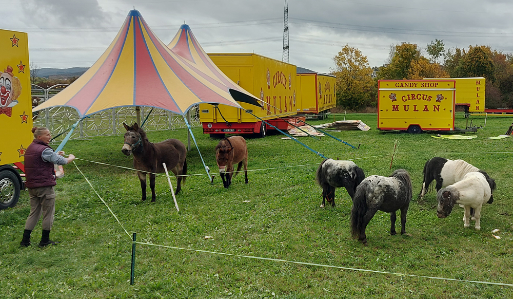 Der Zirkus heißt Mulan*2) nach einem Disney-Film von 1998, in dem ein junges Mädchen als Soldat verkleidet den Platz des Vaters in der chinesisches Armee einnimmt. „Frauenpower“ sagt Jacqueline Köllner, die Chefin des Zirkus Mulan. Und Power braucht sie, wenn sie an 365 Tagen im Jahr von 6.00 bis 23.00 auf den Beinen ist. Ebenso ihre Mitarbeiter/innen. Samira und Dominik sind mit 13 und 14 Jahren die jüngsten. Ein Schlangenmädchen, das auch Hula hoop beherrscht und ein Meister auf dem Rola Bola-Brett. Kraft-Balance kann er auch. Können Sie auch einen Biertisch auf dem Kinn balancieren? Frau Köllner verkörpert den Clown Spaghetti und arbeitet gerne mit den Tieren. „Ich wollte immer zum Zirkus, so bin ich es von meinen Eltern gewöhnt, aber wenn ich noch eine Wahl hätte, dann wäre ich gerne Tierärztin geworden. Allerdings fehlt da der Applaus.“