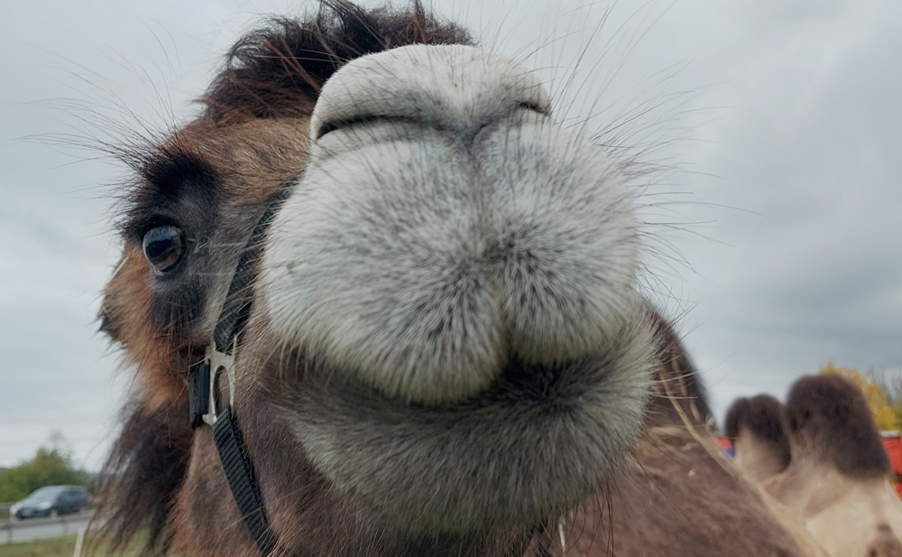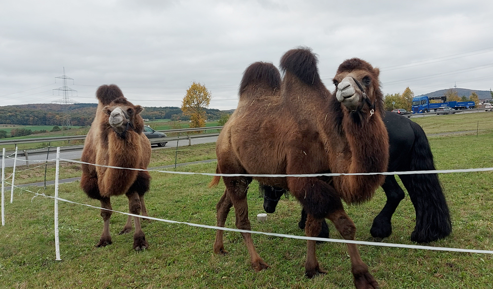 Es gibt zwei mongolische Kamele, Tonja, die hellere, ist acht Jahre alt und Baby vier. Ich hatte schon vermutet, dass es sich um asiatische Kamele handelt, denn sie haben ein besonders dickes Fell. Zwar wurden diese zwei in Deutschland geboren, tragen aber natürlich ihr mongolisches Erbgut. Und in der Mongolei kann im Winter die Temperatur schon mal auf -40°C sinken. Vor allem aber unterscheidet man sie an der Zahl der Höcker: Das asiatische Trampeltier hat zwei, das afrikanische – das Dromedar – nur einen. Im Höcker werden Energiereserven gespeichert.