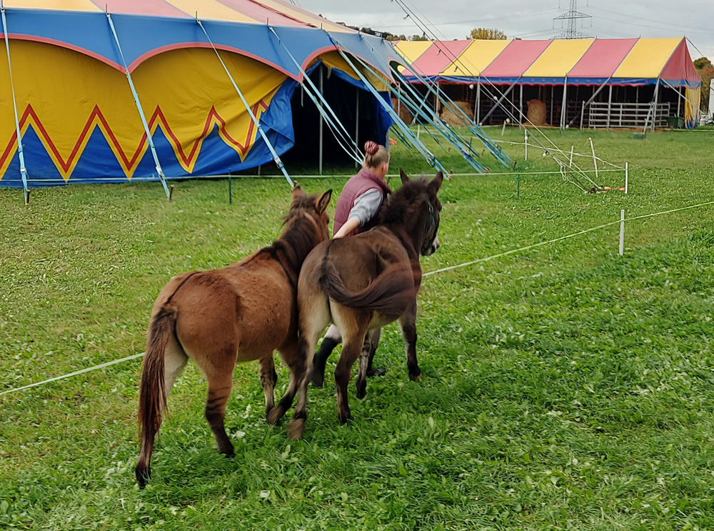 Ein wunderschönes weiches Fell haben auch die beiden Maultiere. An den Hinterfüßen sind sie gestreift, ein Erbteil einer ganz alten Maultierrasse. Alle Tiere, die ich streicheln wollte, waren zutraulich und ließen es sich gerne gefallen. Nur Peppel war weniger zugänglich. Außer ihr spielen noch drei weitere Mischlingshunde in unterschiedlichen Größen im Zirkus mit.