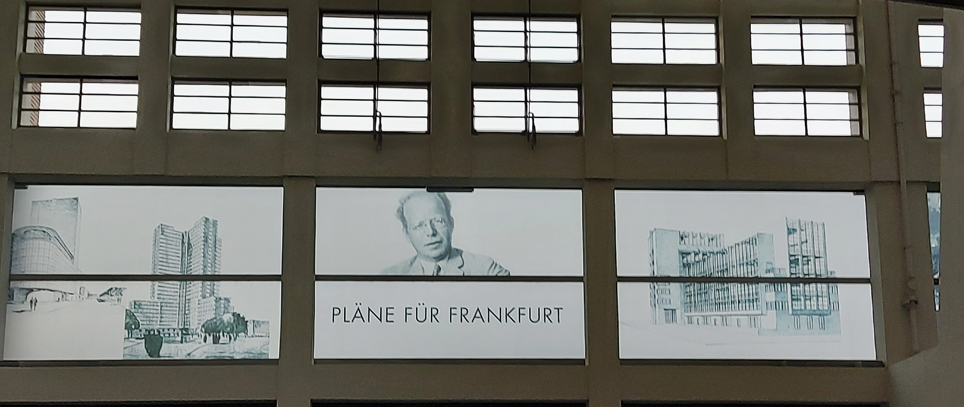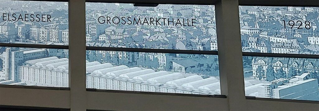 Die EZB wurde auf dem Gelände errichtet, auf dem 1928 die Frankfurter Großmarkthalle gebaut worden war. Da die Großmarkthalle Denkmal geschützt ist, steht sie noch immer, aber vollkommen – und wie ich finde sehr gut – in das neue Gebäude integriert. In den Fenstern setzte sich damals der Erbauer Martin Elsässer selbst ein Denkmal.*2)