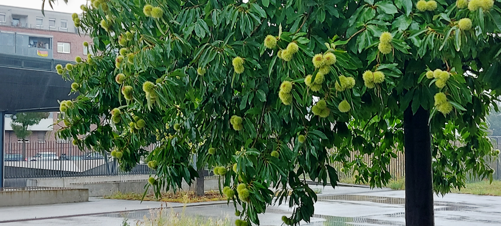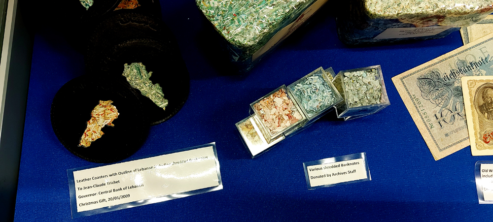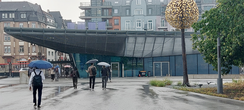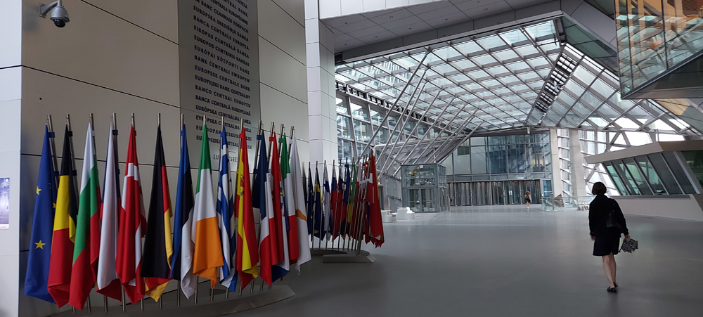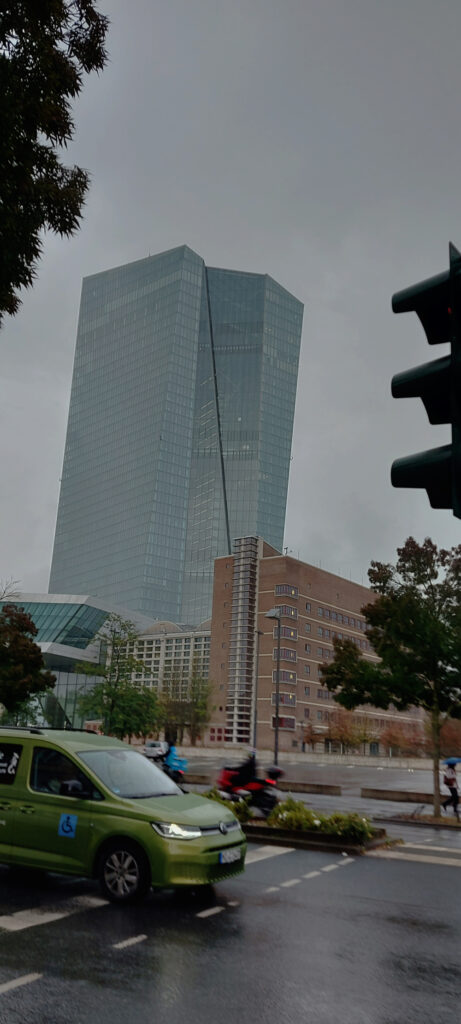 Ehrenamtliche Tätigkeit macht meistens Freude. Manchmal erhält man darüber die Gelegenheit, etwas Besonderes kennenzulernen. Über die Hessische Fachstelle der öffentlichen Bibliotheken bekamen wir eine Einladung, die Bibliothek der Europäischen Zentralbank zu besichtigen. Das taten wir an einem ziemlich verregneten Tag Anfang September. Der bekannte Turm war auch vom Parkhaus her nicht zu verfehlen. Nach einem Sicherheitscheck wie am Flughafen durften wir das Gelände betreten, wo als erstes ein „Goldbaum“ und viele Esskastanien mit reifen Früchten auffielen *f). Im Eingangsbereich hingen die Fahnen der 20 Staaten, die den €uro als Währung haben: Belgien, Deutschland, Estland, Finnland, Frankreich, Griechenland, Irland, Italien, Kroatien, Lettland, Litauen, Luxemburg, Malta, Niederlande, Österreich, Portugal, Slowakei, Slowenien, Spanien, Zypern.