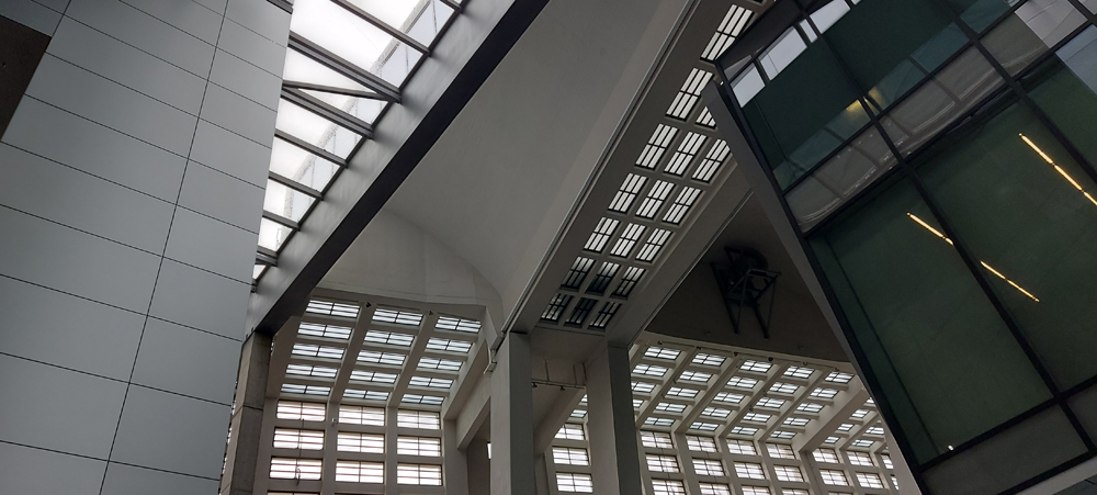 Svetlana, die Bibliothekarin, die uns führte, zeigte zuerst einige Räume und exemplarische architektonische Blickpunkte, bevor es in die Bibliothek ging. Diese befindet sich auf derselben Ebene wie die Cafeteria. Beide Räume gehen ineinander über. Auf diese Weise will man die Menschen „reinholen“. Sie können dort lesen, Kaffee trinken, Schach spielen oder Events veranstalten. Die Bücherei hat viel Platz und ist auch dafür gedacht, dort zu zu arbeiten. Im Zuge der Modernisierung vor einigen Jahren wurden 17 „Magische Inseln“ geschaffen. Es gibt angeschlossene Konferenzräume und einen „Stille-Raum“. Einer dieser Räume ist in verschiedenen Grüntönen gehalten. Er wurde in letzter Zeit mehrfach als „Nachtraum“ genutzt, um „KI generierte Probleme zu lösen“. Geplant sind noch eine Vielzahl an Arbeitsplätzen als „Open Space“. Die Ausleihe der Bücher erfolgt per App.
