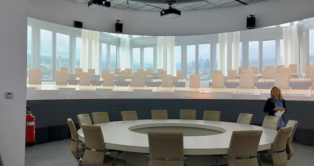 Wir sahen die Mooswand, vor der Christine Lagarde, seit 1. 11. 2019 offizielle Präsidentin der EZB, gerne Pressevertreter empfängt. Der abgebildete Konferenzraum ist nur eine Imitation des echten Konferenzraumes für die Vertreter der Mitgliedsländer im 5. Stock.